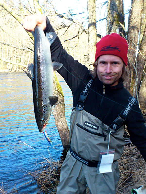 laxhonan återutsattes såklart, och jag återgick till mitt eget fiske. grabben fiskade med en stort gammalt toby och det verkade vara melodin. jag var inte sen att hänga på och tro det eller ej, endast efter några kast hade toby levererat även för mig!
